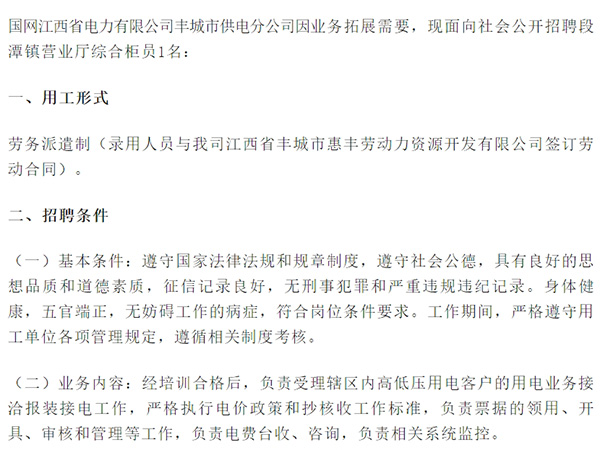 ->查看國(guó)網(wǎng)江西省電力有限公司豐城市供電分公司因業(yè)務(wù)拓展需要,現(xiàn)面向社會(huì)公開招聘段潭鎮(zhèn)營(yíng)業(yè)廳綜合柜員1名:一、用工形式勞務(wù)派遣制(錄用人員與我司江西省豐城市惠豐勞動(dòng)力資源開發(fā)有限公司簽訂勞動(dòng)合同)。二、招聘條件(一)基本條件:遵守國(guó)家法律法規(guī)和規(guī)章制度,遵守社會(huì)公德,...